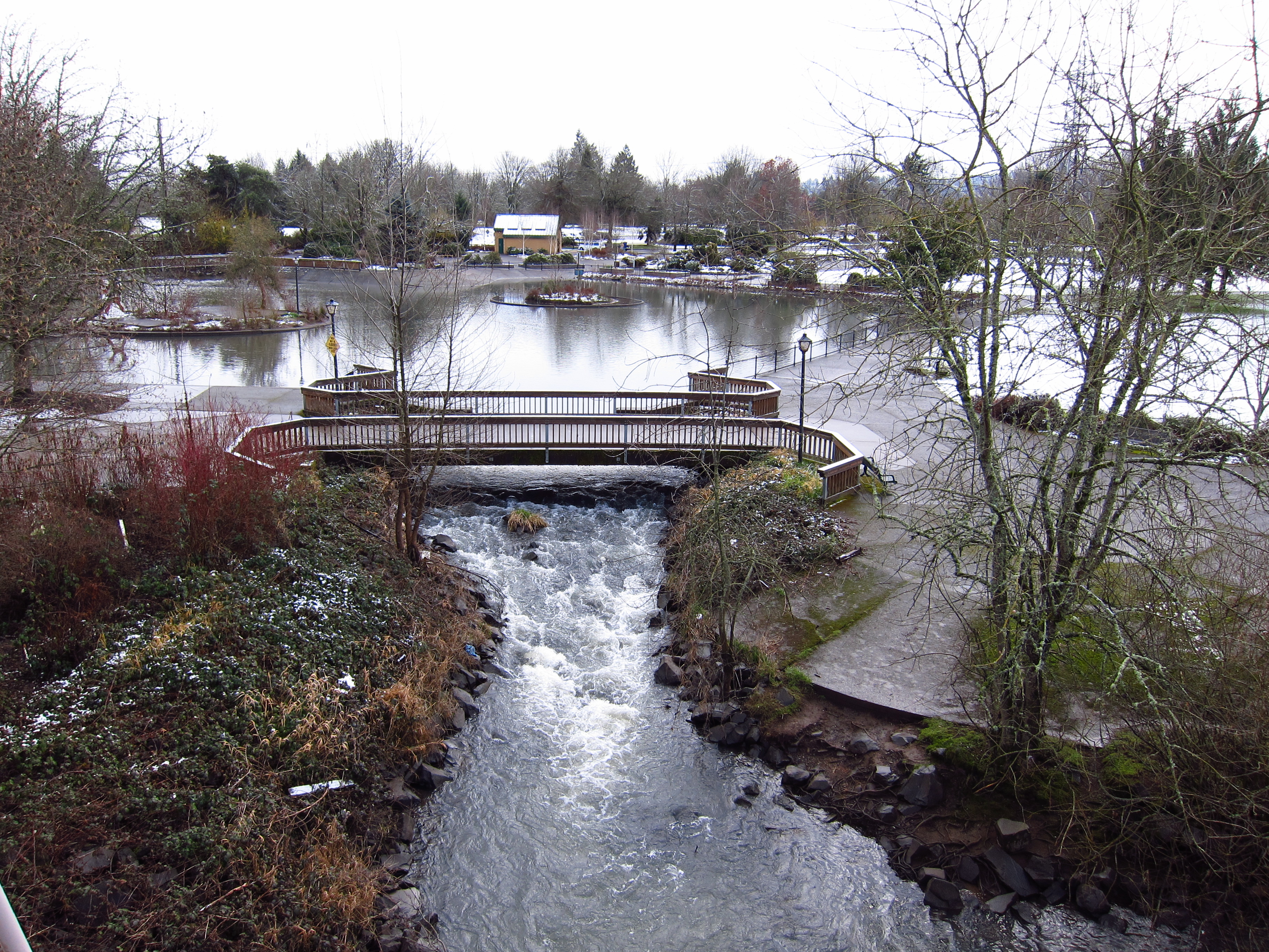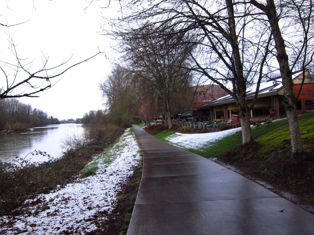After I cross the bridge, I start going west, towards the sun. In the Summer, at this time of the day it is warm and the river is crowded with kids floating down the river on all sorts of tubes or on whatever they can float. The bike path gos though a park and crosses this small water fall.
