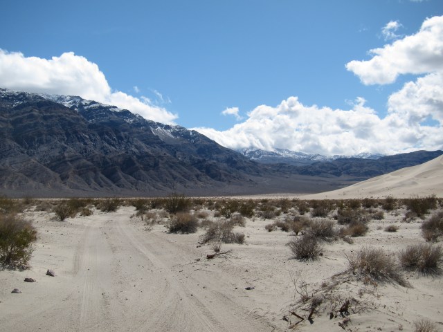 We continued on the road that goes to the left of the dunes, and around them, going between the dunes and the mountain range to the left, in the direction of Dedeckera canyon.