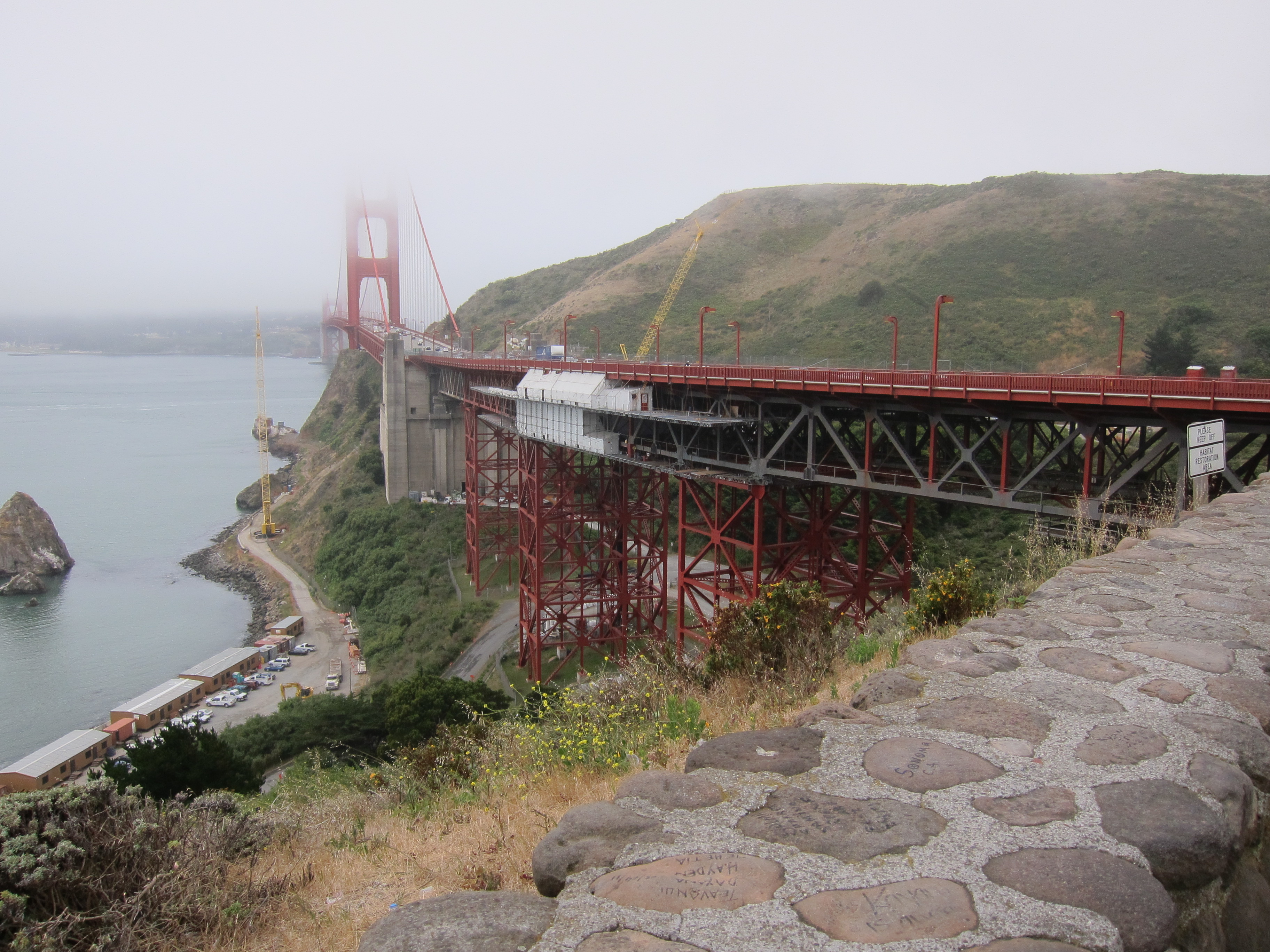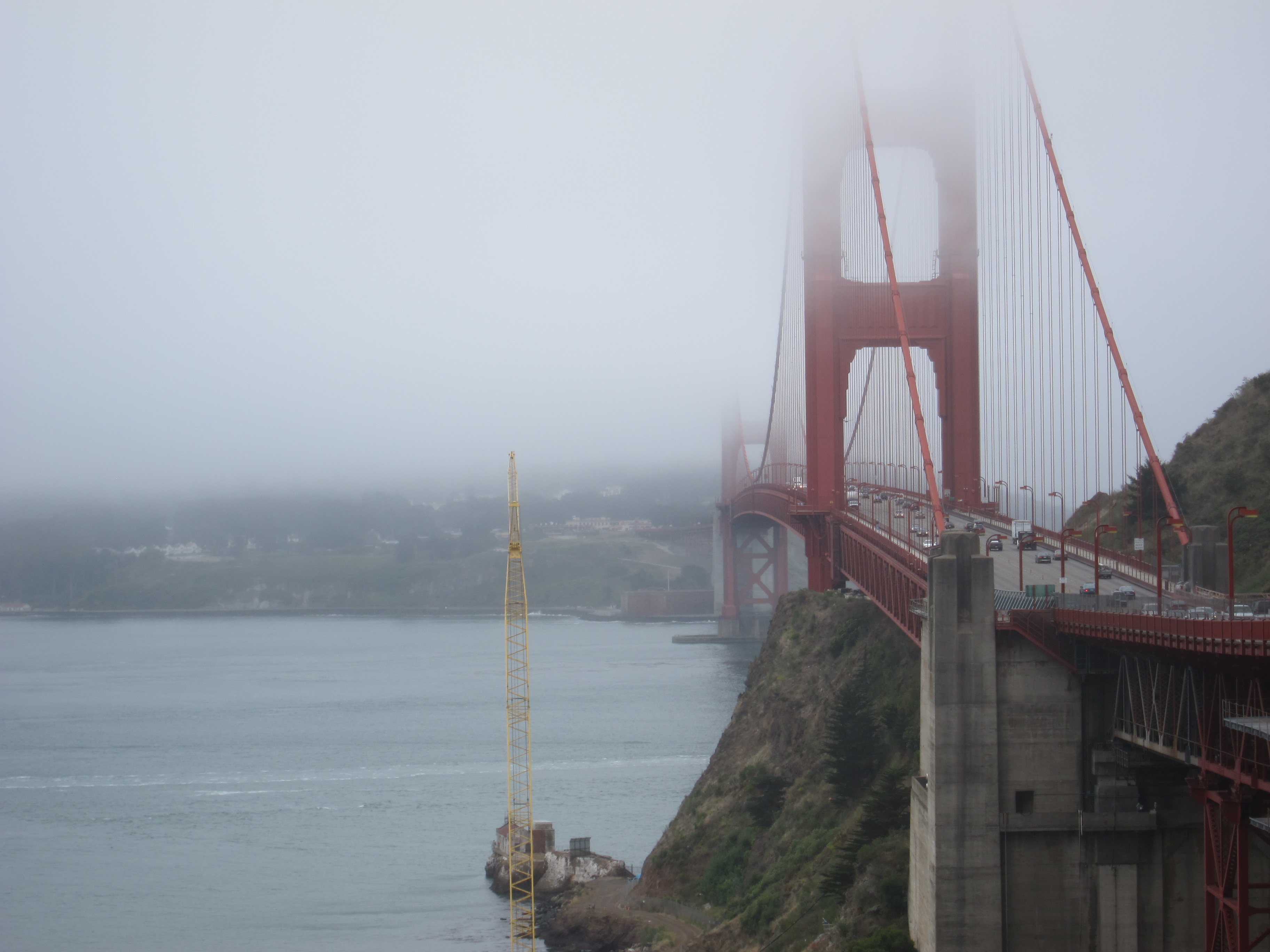 I stopped at the north east view area of the bridge. How beautiful and fitting that it was a foggy day, considering the many times I stayed at the Eugene airport, waiting, as my flight had been delayed getting into San Francisco because of this very fog. You can see the arch on the bridge and the anchor points where opposite forces not totally, but probably somewhat cancel out.