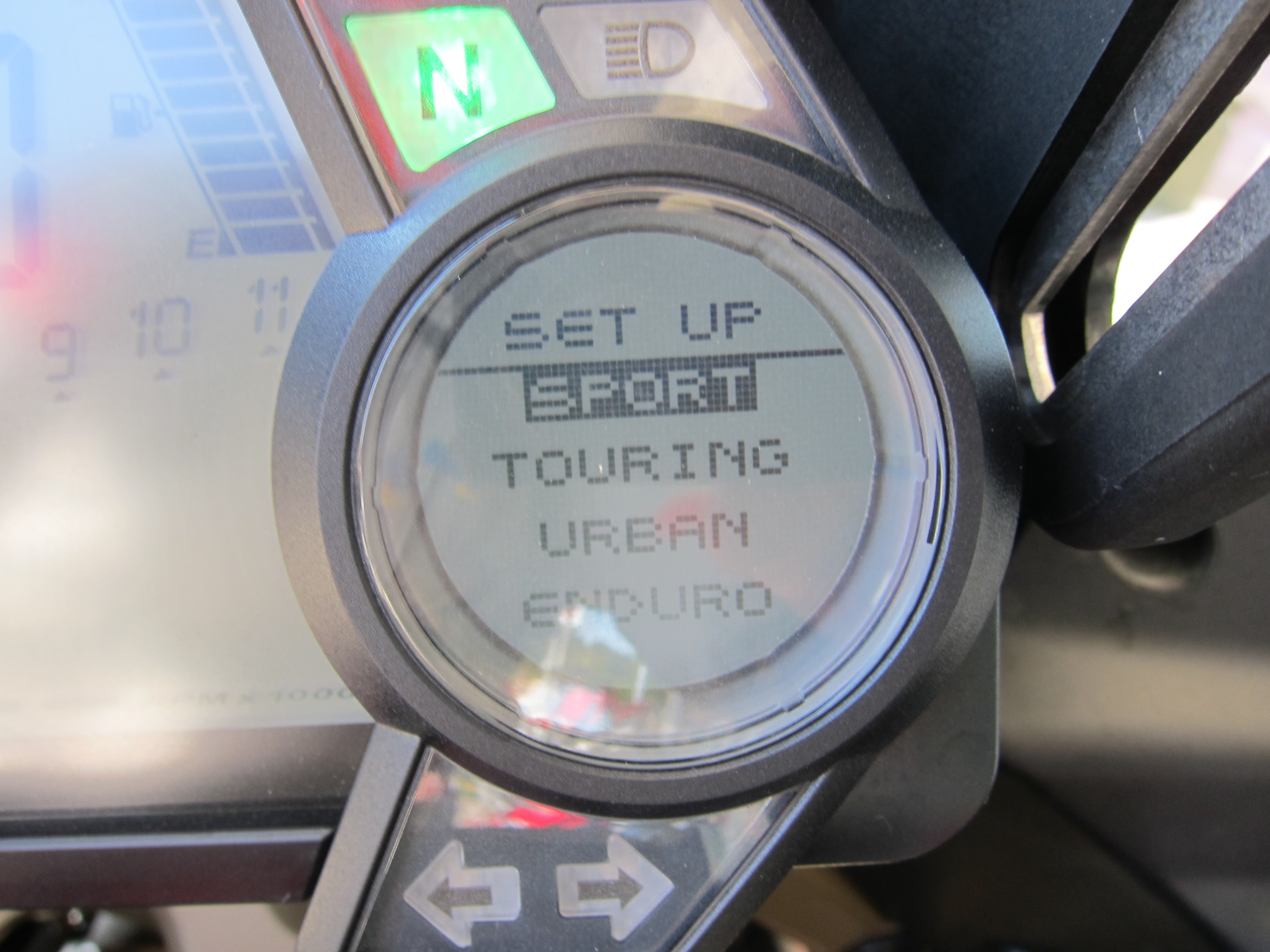 It has a very informative panel. The information is managed by buttons in the handle bar, left side. You can even change riding mode on the fly, by pressing the clutch all the way while pressing one button. By the way, on the above set up I have the bike on “sport” mode with “no passenger, no bags” (that is the one helmet icon below “sport”). The only negative comment I will make on this bike’s design is regarding the dashboard. Although it is great for being efficient for packing a lot of information on a compact package, in my opinion nothing substitutes an analog tachometer.