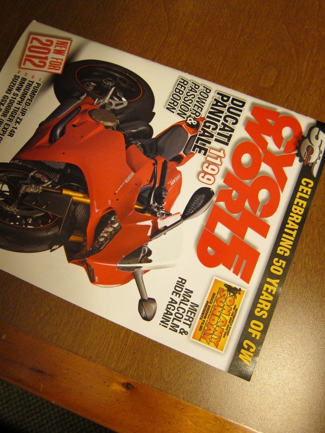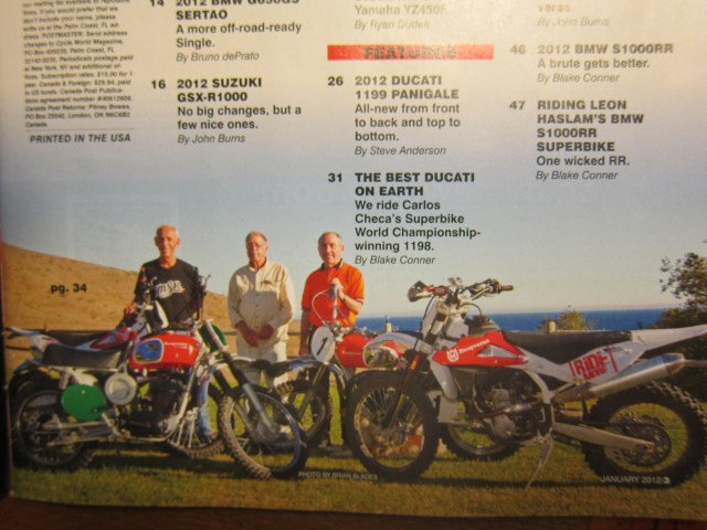 If you like motorcycles and you haven’t seen the film “On Any Sunday,” or you haven’t seen it in a while, now would be a good time to see it again. I picked up the January 2012 issue of Cycle World, the one with the beautiful Panigale on the cover (yes, you can’t miss it on the magazine stand), and they are featuring a reunion of the cast of characters involved in the filming of “On Any Sunday” minus the missed Steve McQueen, of course.