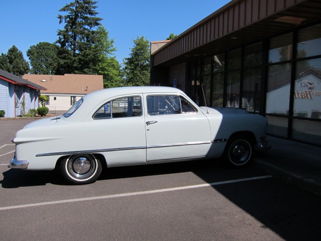 My first recollection of a car associated with my father was a 1951 Ford Custom. That car belonged to my grandfather and my father borrowed it on a semi-permanent basis. It was light grey, almost white. I found the car of the photo below on one of my motorcycle trips last year, when I was traversing the south neighborhoods of Salem, here in Oregon. It was the same color as my father’s car, except my father’s car was a four-door.