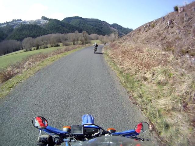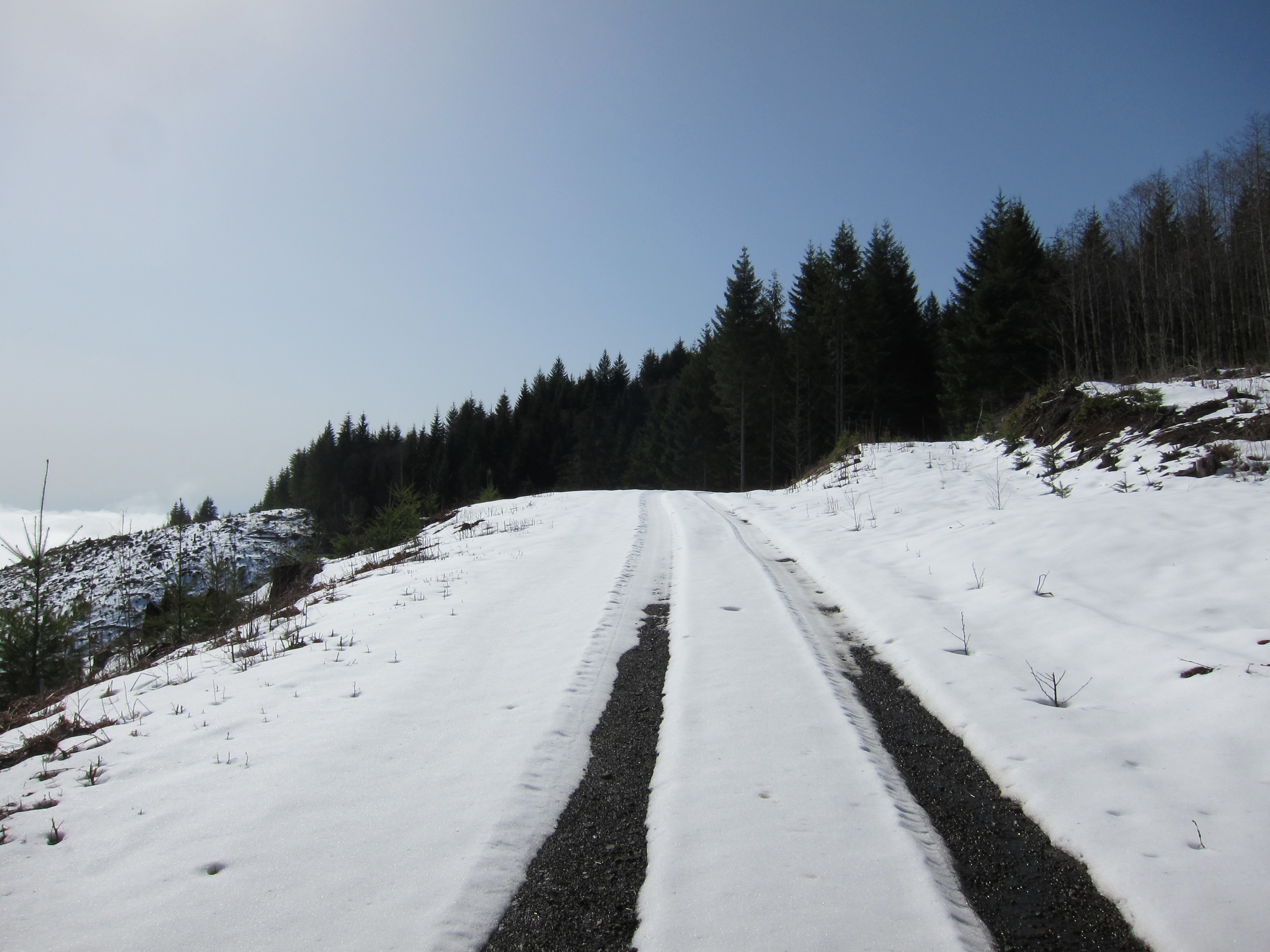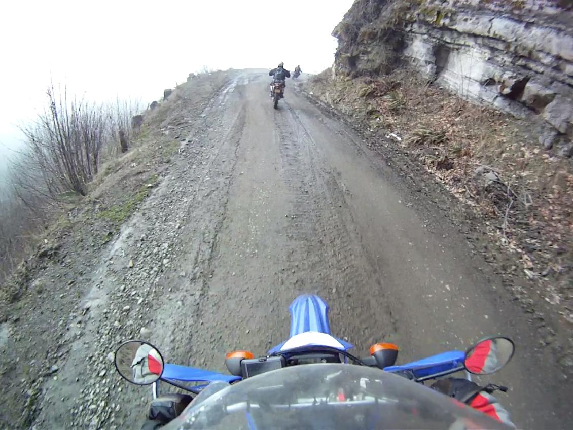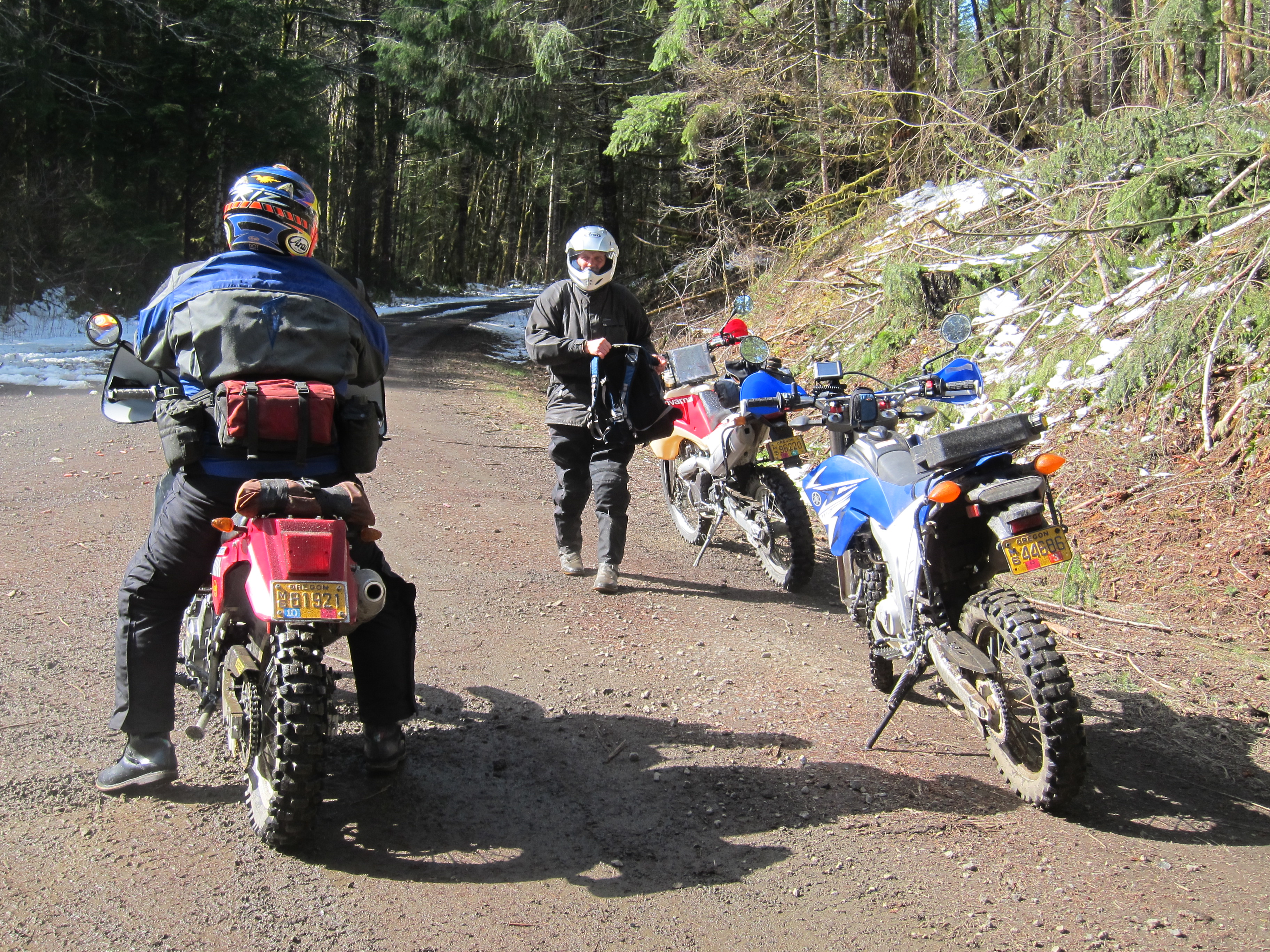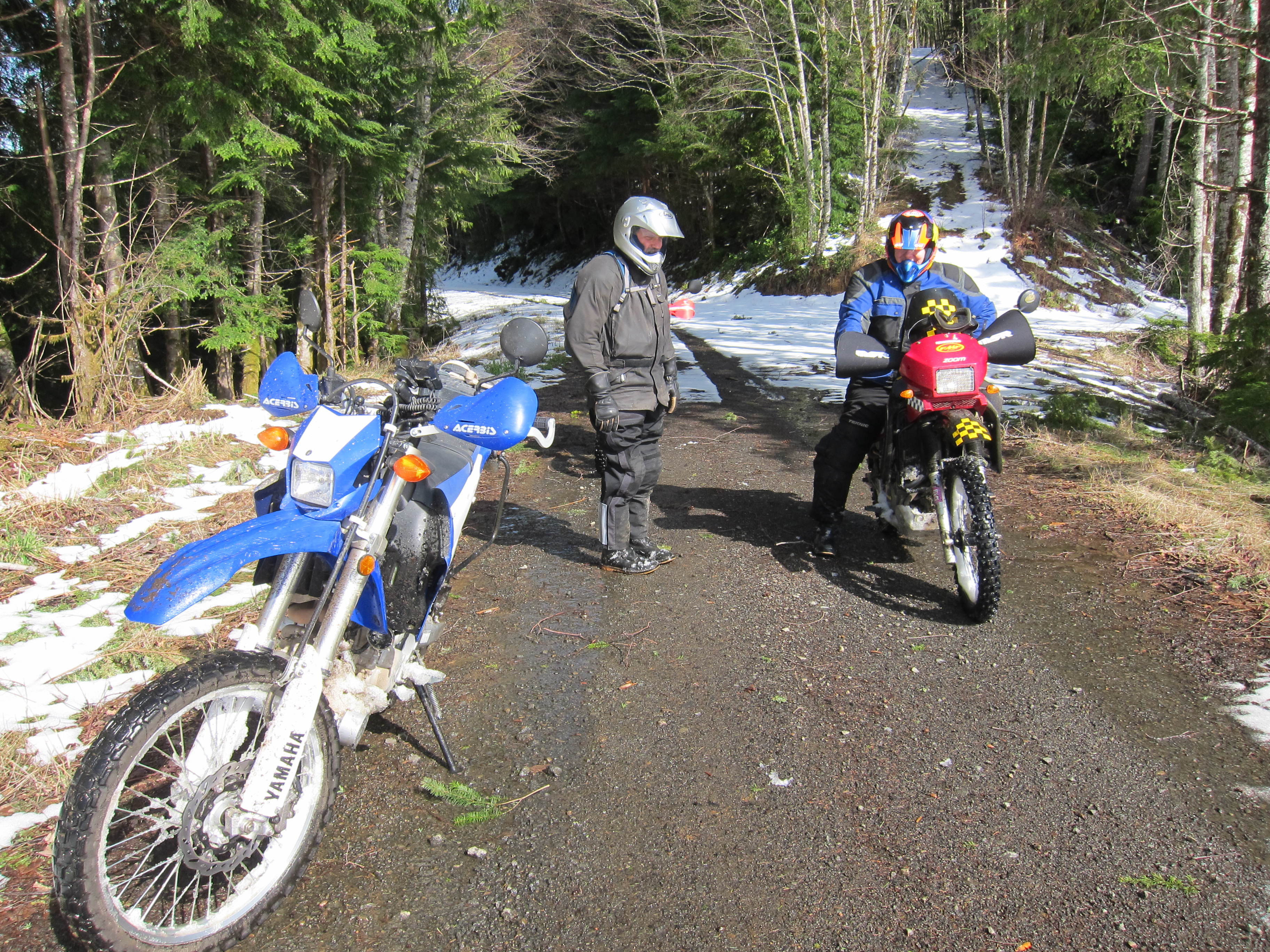 I was having a blast, these guys were riding at a good clip, as you can see from this video. The road conditions were OK. Not dry, but the mud was not deep, and most of the wet areas had enough gravel to maintain good traction. But I could see snow accumulated here and there on the sides of the road. We were getting close to the snow level, as you can see at the end of this 3 minute video.