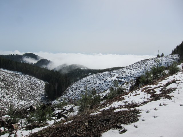 This time, no small talk. We got down to business right away. Soon we were on Grimes Rd. and a few roads after, one left, one right and we were climbing and got on this short cut to the left that would put us on the west side of the High Pass rd gate. And again, once we hit dirt Riley is flying and I have to concentrate to keep up with them. This short cut was very slippery, for the first time I thought about getting a new front tire for this bike. With more than 5,500 miles on it, this tire is still the one that came with the bike. And on this little road I could feel the front skipping every now and then. Also, you will notice, lots of branches fallen on the road. That is the result of all that snow of three weeks ago, and heavy rains, and strong winds. Welcome to our new weather pattern.