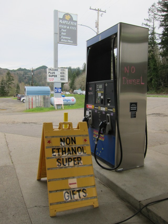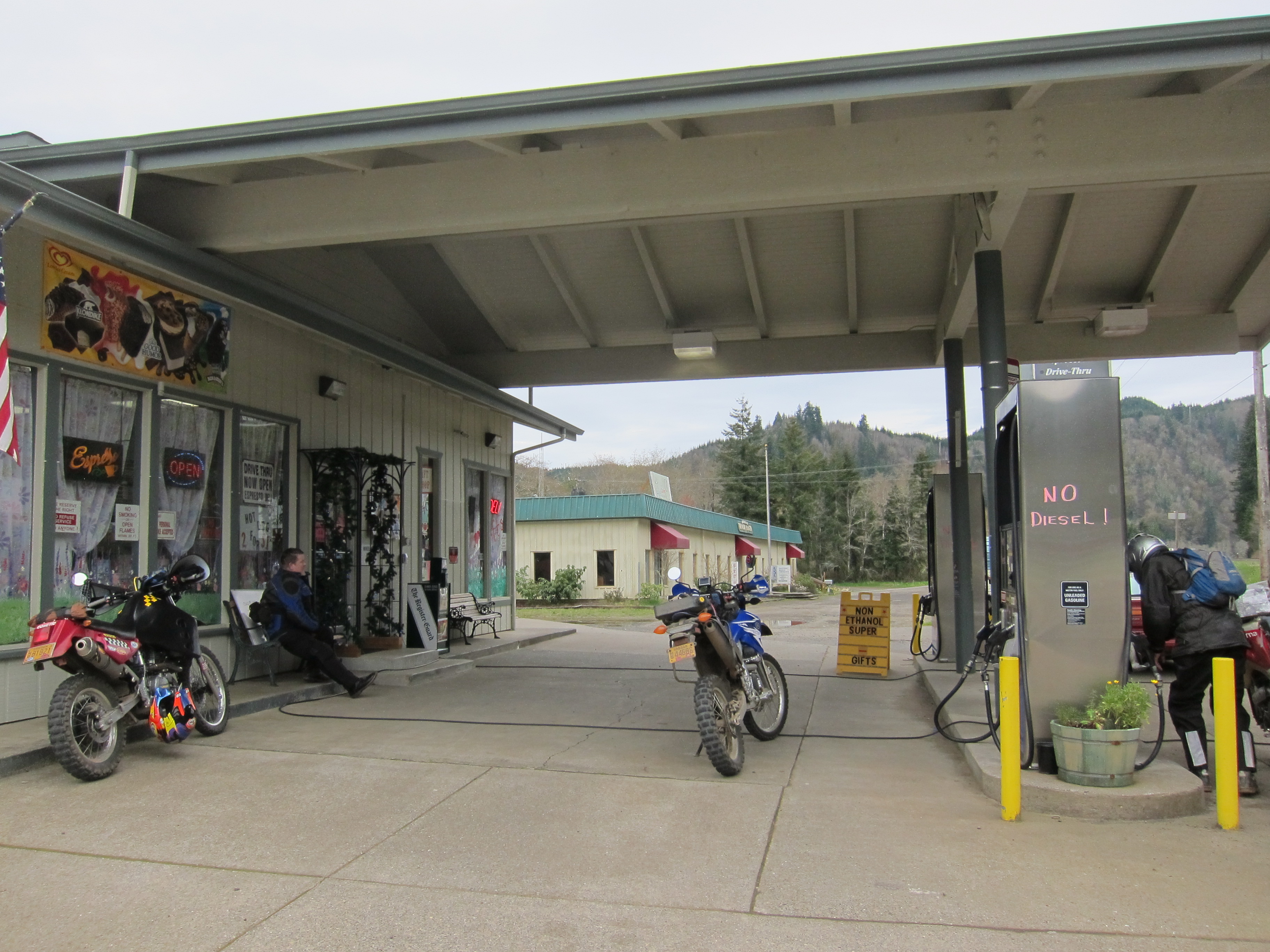 From here Riley took us on a new set of nice back roads, completely by-passing Florence all the way to Mapleton where we stopped for refueling. My bike arrived in fuel fumes after 120 miles of hard riding. Not bad, more than 60 mpg, as it took 1.95 gallons of fuel (tank holds 2.1 gallons).