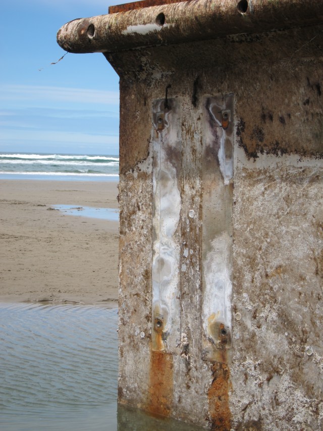In Newport, from Nie Beach you can barely see the action at Agate Beach, where this big chunk of concrete had run aground.