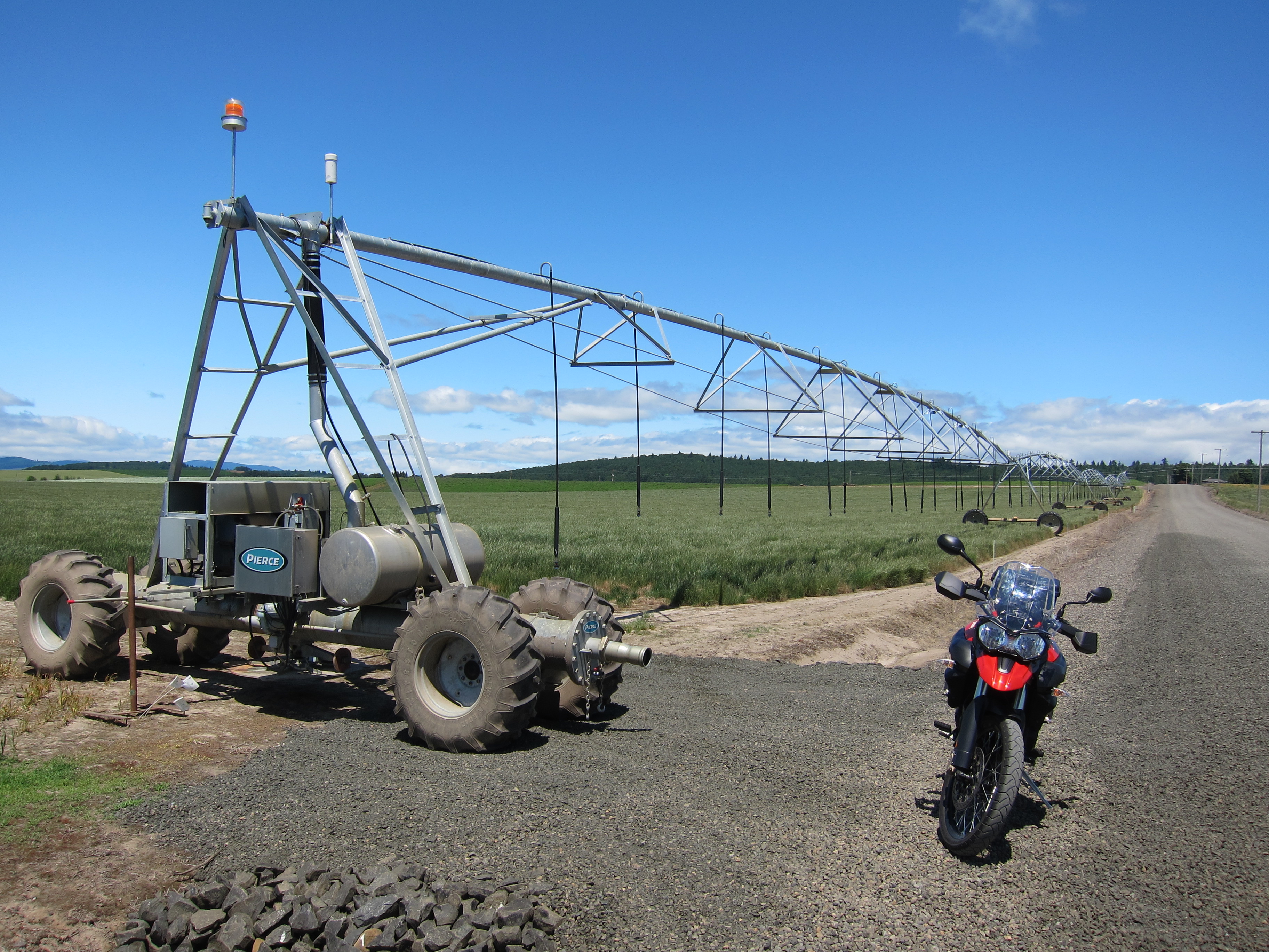 As you can see, the weather forecast was correct. As soon as I reached the valley, it was dry and sunny. The Tiger is small compared to this irrigation rig.