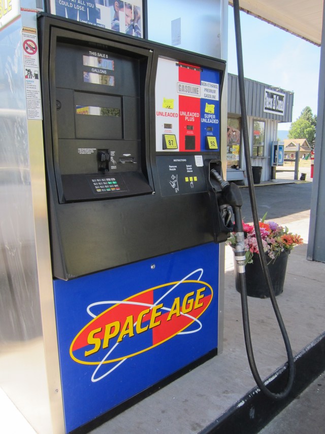 We said good bye at some point, already close to 11:00 am. They went back to Portland and I went towards Sisters, to the Space Age gas station. I’m a regular customer when passing through Sisters. I like the looks of the pumps, and it has that non-ethanol premium gasoline.