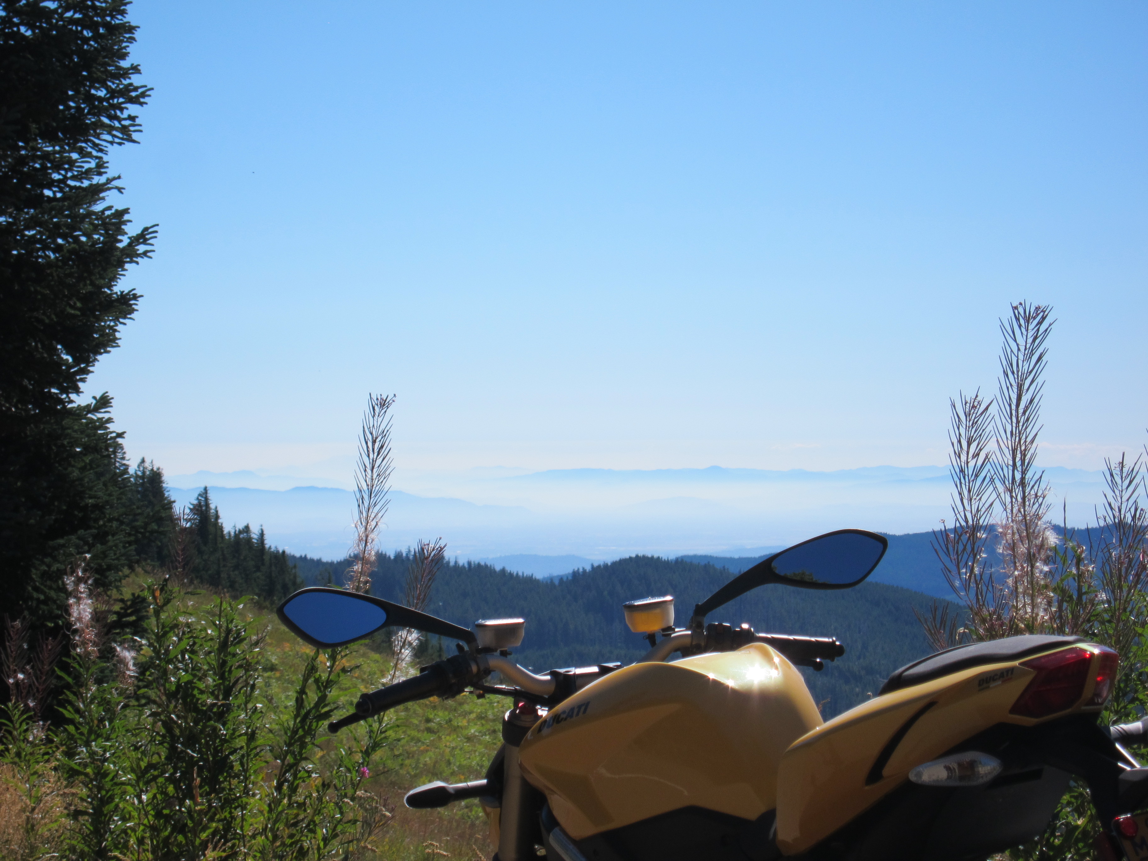 What a stark contrast in the weather from thick fog on the coast to a beautiful sunny day up top on the mountain. And there must be some teriffic riding in between. That duke would be loving those mountain passes.