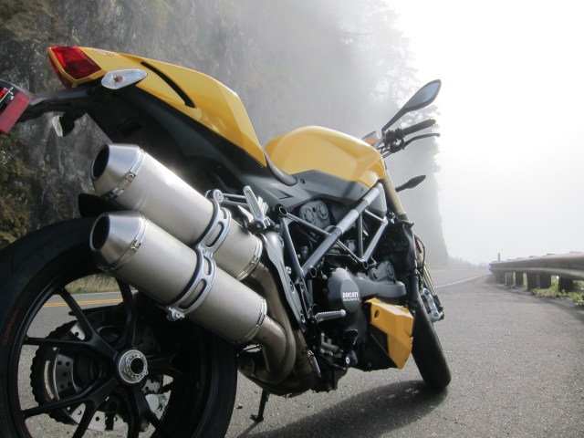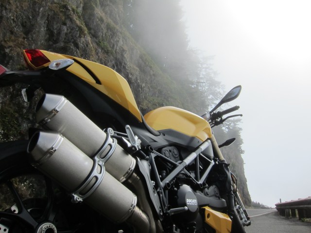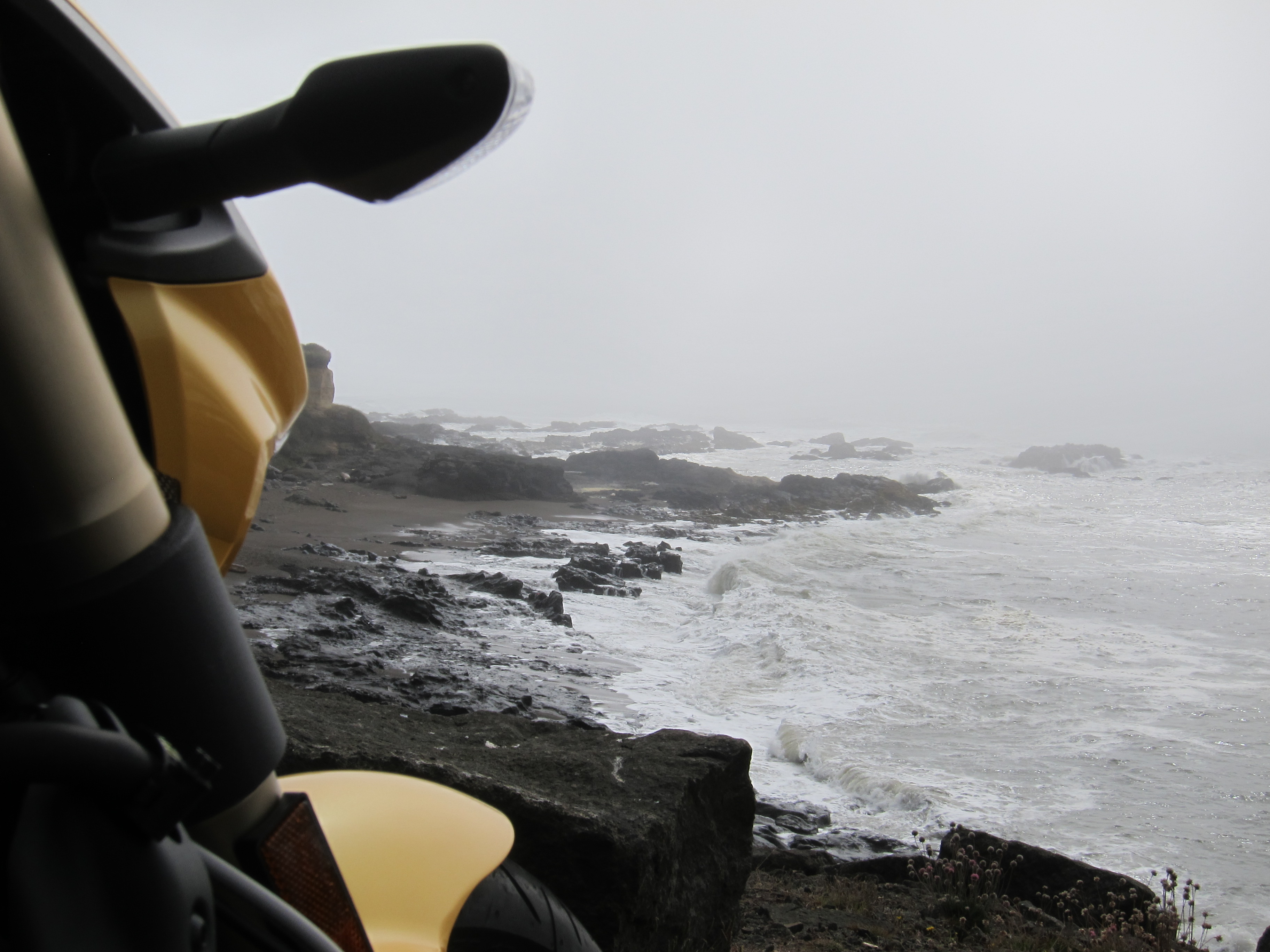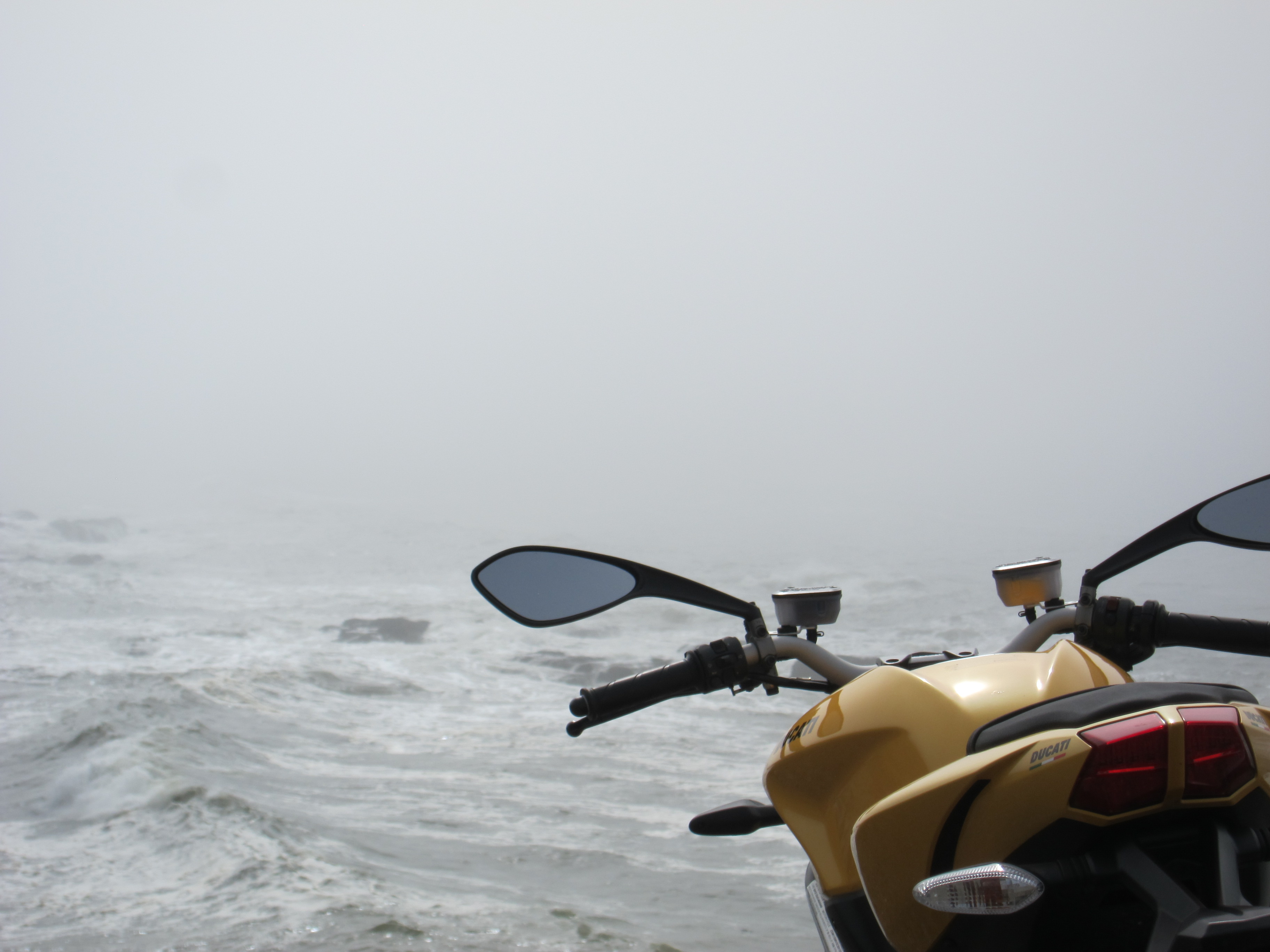 The coast looks COLD, but the Duc makes up for it. A splash of yellow contrasted with the dull grey of the fog.