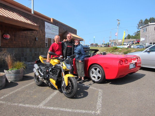 That was the first time I met Bob and Yvonne. We had a great meal, with a pleasant conversation. Bob and Yvonne had driven their Corvette from British Columbia and this area between Yachats and Florence was as far south as they were going to be on this trip. And with this weather, with the top down on a nice Corvette, this must as good as riding. After the meal we went out for a photo shoot in front of the restaurant.