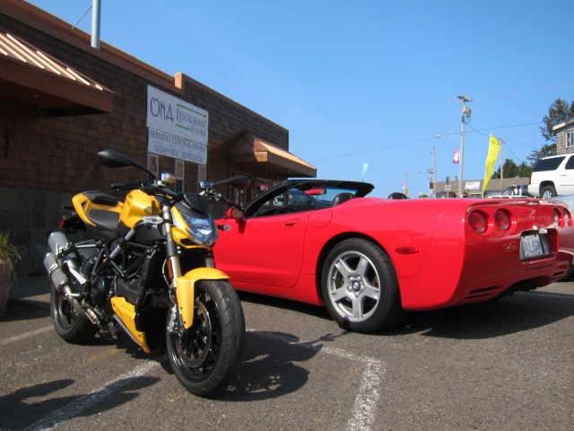 That Ducati yellow sure is pretty against the blue of the ocean. A nice contrast to Bob’s Corvette too.