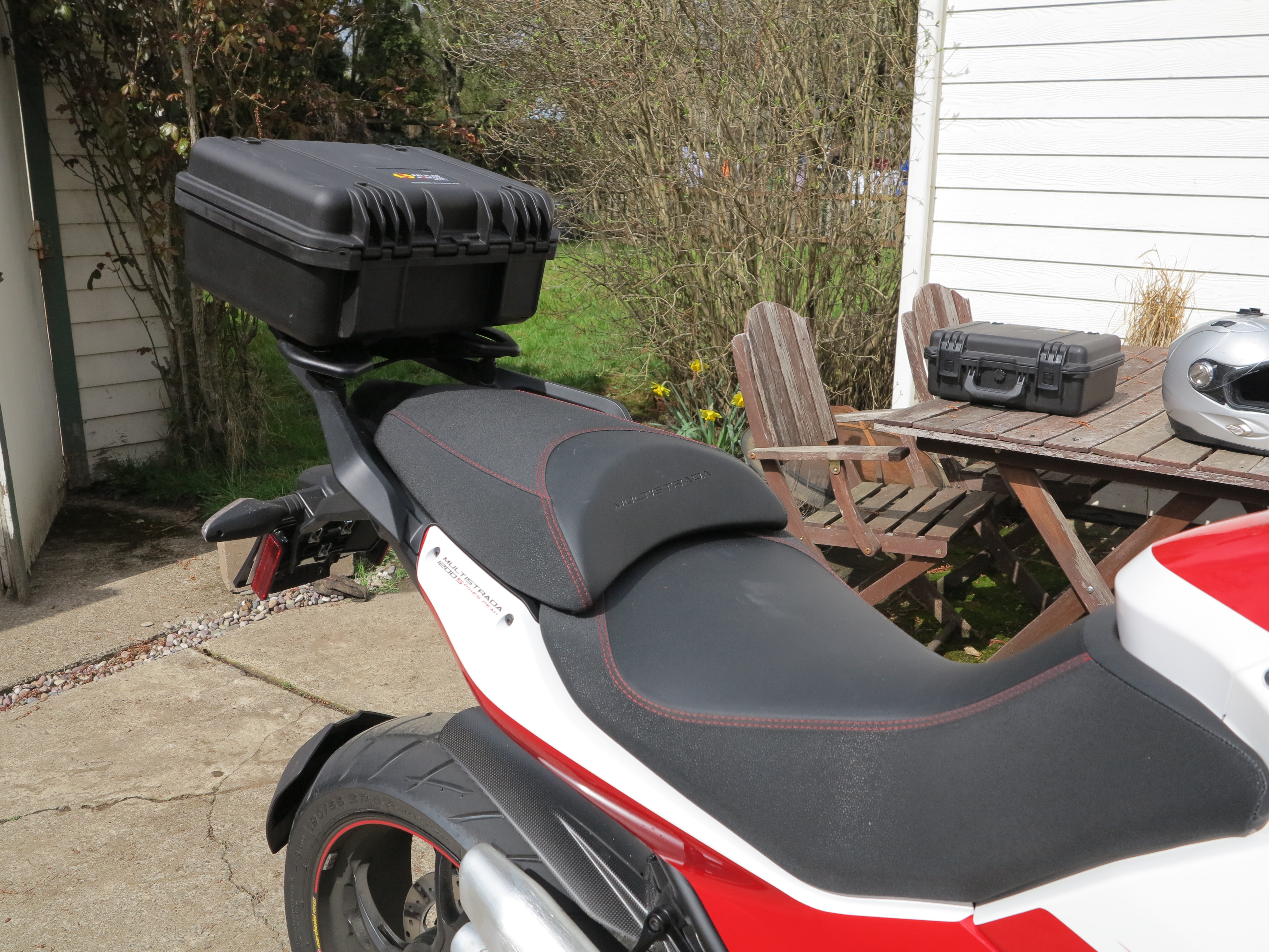 I really dig the new Pelican Storm top case, your Triumph setup was one of the inspiration for mine…http://www.ducati.ms/forums/216-2010-current-2nd-generation-watercooled/180065-my-pelican-top-case-install.html