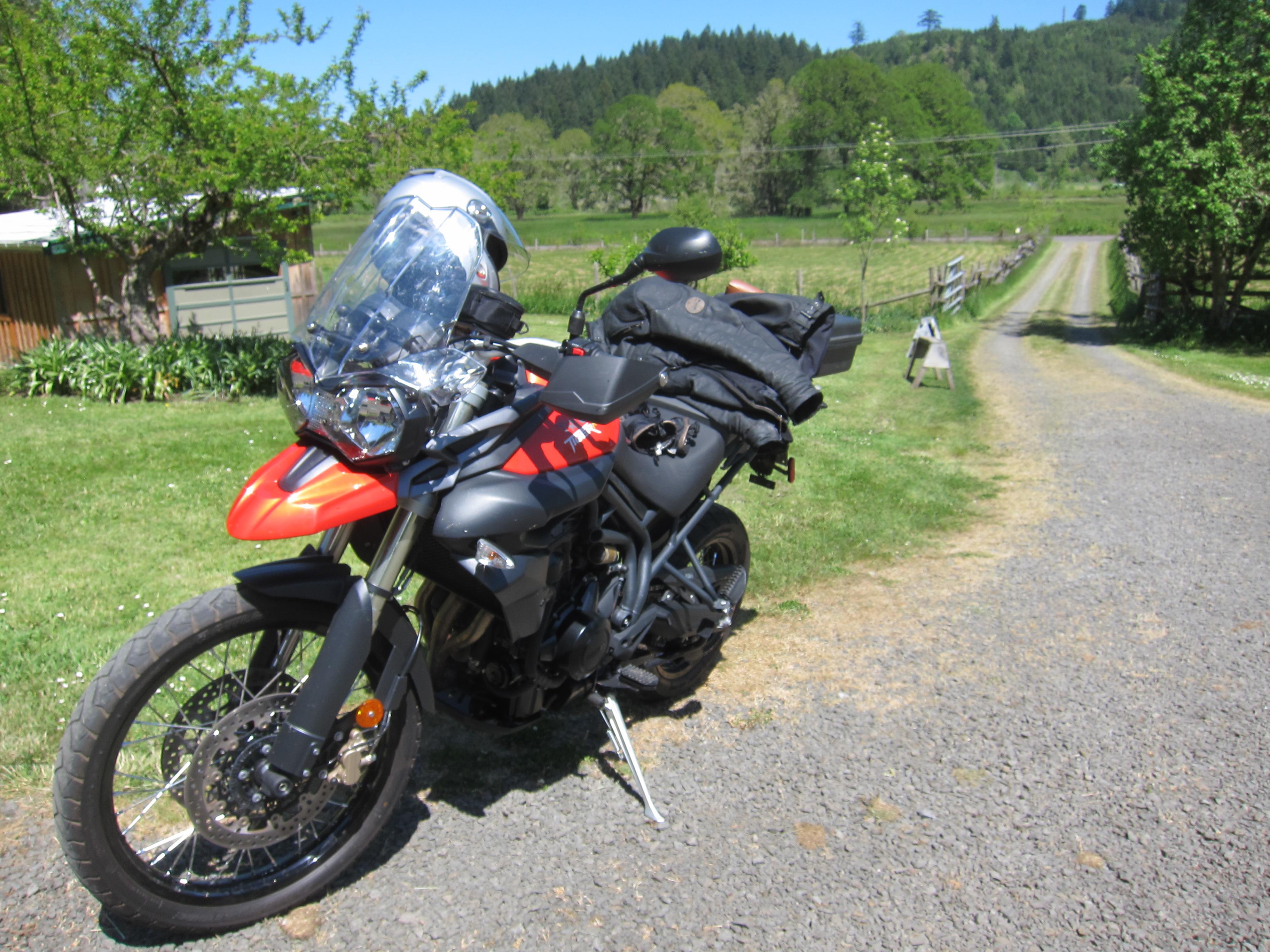 I got the Tiger ready and went on the business of searching for a can of chain lube. One thing led to another and when I came to my senses I was on Wolf Creek road, some 20 miles off course. I know this happens to you, to some more than to others, when the motorcycle is the one taking you along for the ride. Eventually I came back down to the valley floor and went past John’s house in Crow and saw familiar cars in their driveway. I thought about stopping by, but continued on, and then I thought some more and turned around. Good thing I did.