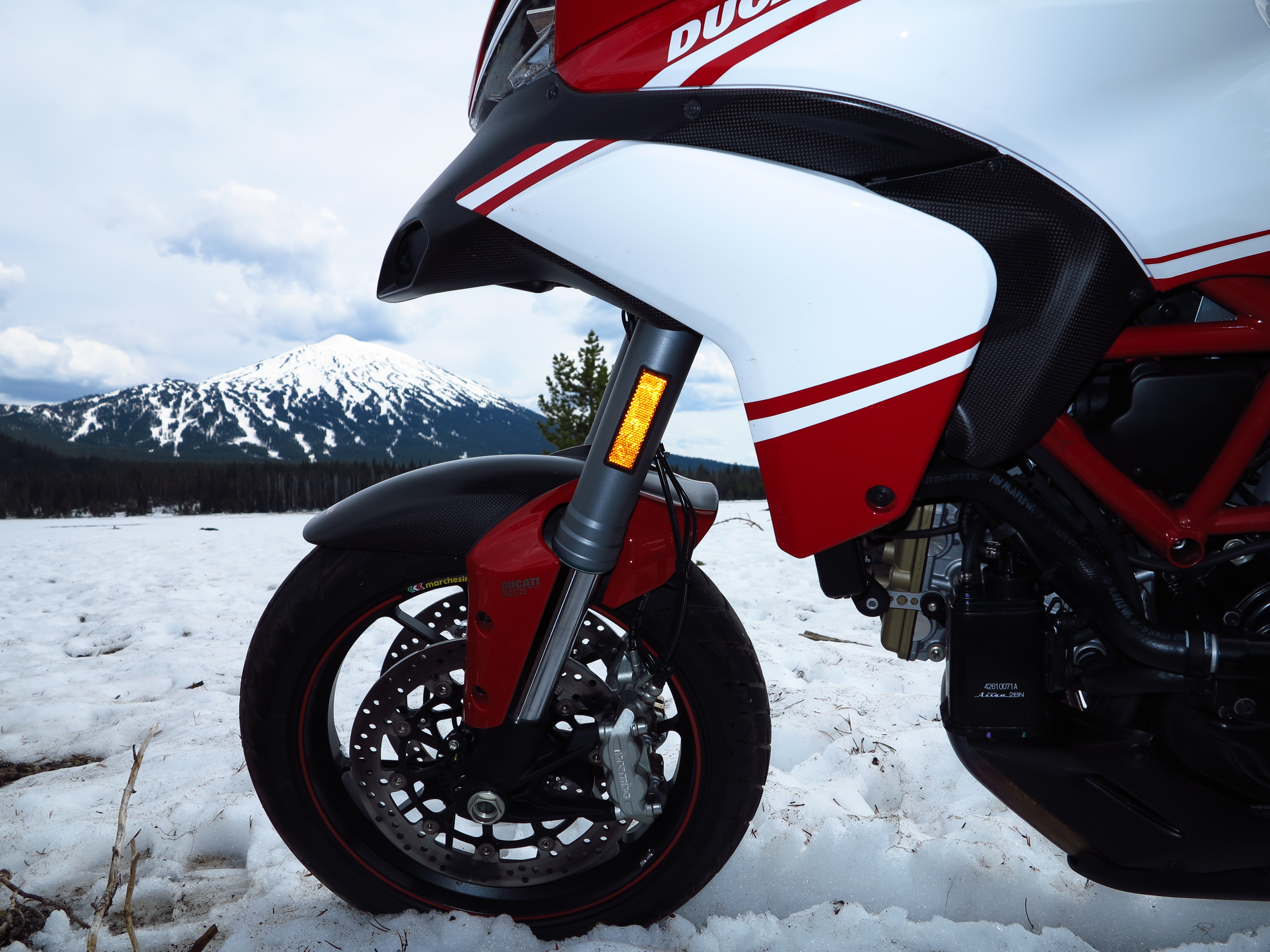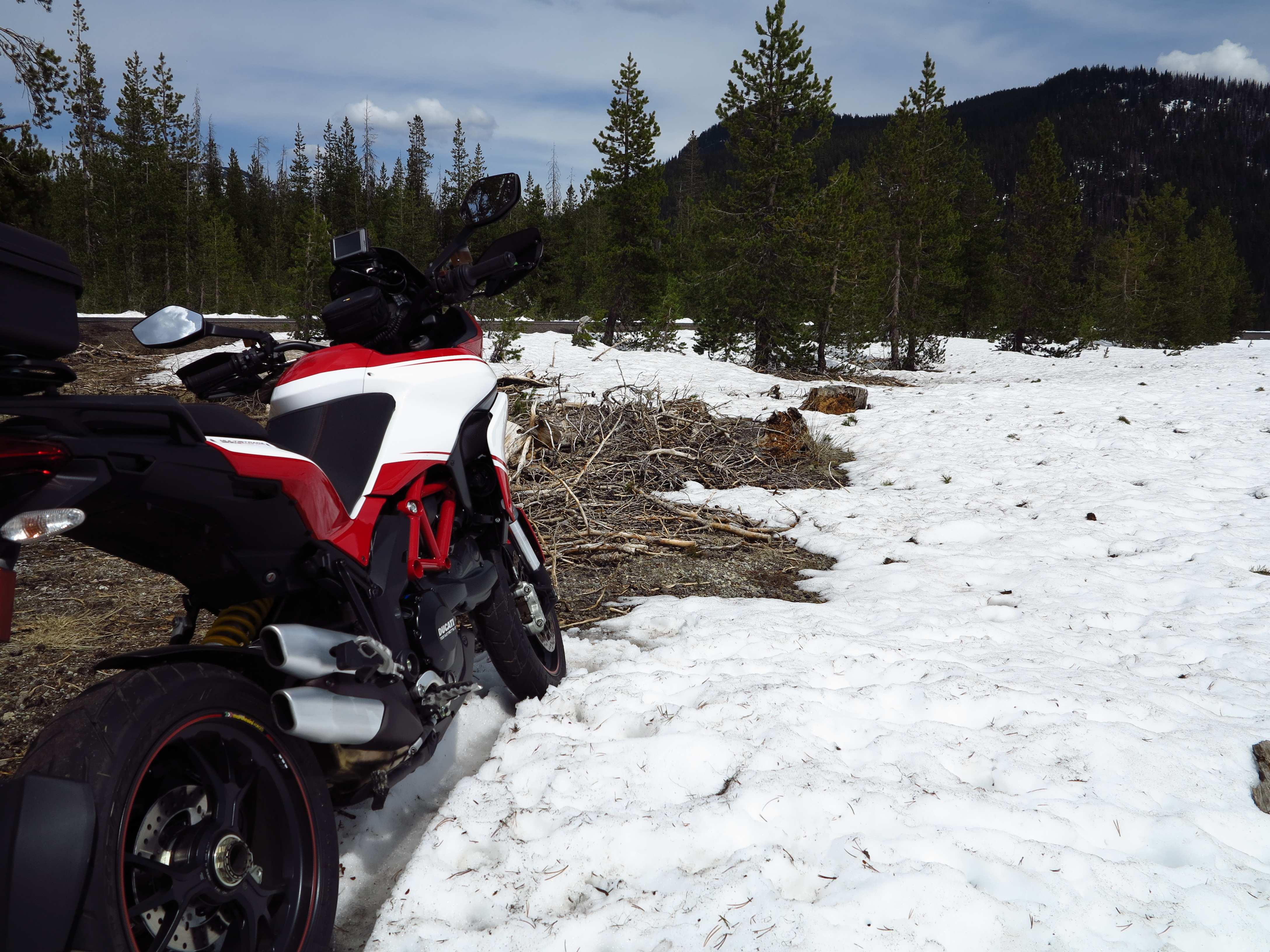 Meandering through the tallest peaks in the mid-Oregon portion of the Cascades, the Cascades Lake Highway is classified as a scenic drive. It starts going west from Bend, passing by the north side of Mt Bachelor at 6,000 ft, before going past the Sisters Wilderness, to the South of the South Sister, and from there turning towards Highway 58 to the south. Portions of this road are high enough on the Cascades that the road closes during the colder months of the year. Early May it opened for the 2013 season, a week later I was ready to ride it. Of course, the bike of choice for the job was my new favorite, the Ducati Multistrada. On my way out I filled its tank with non-ethanol gasoline.