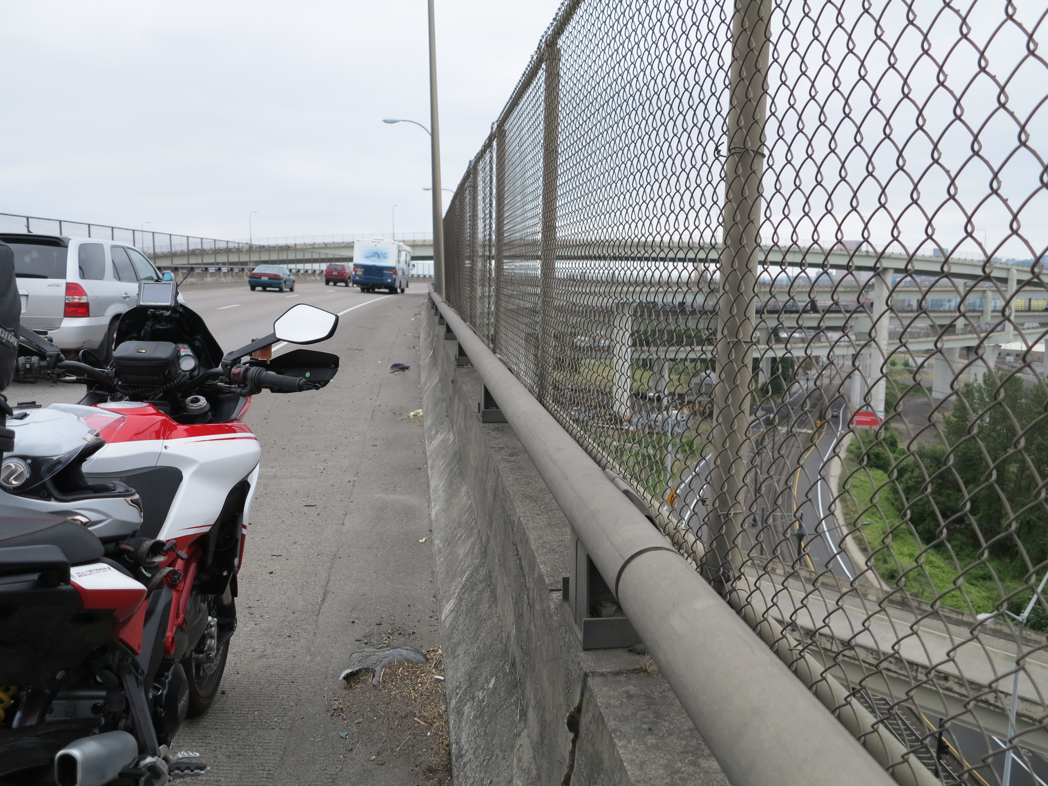 The next day I say my goodbyes early in the morning and start my way back to Eugene. I did not have a route programmed yet. I was thinking of crossing the Columbia on the I-5 bridge and from there find my way west towards the coast. But as soon as I’m about to get on the I-405 bridge I feel the rear of the bike gets loose, the dreadful feeling of a flat tire… I stop and it is confirmed.  Well, I have the kit to fix it.  But I quickly learned it was not a nail perforation. It was a cut. I could not fix that.