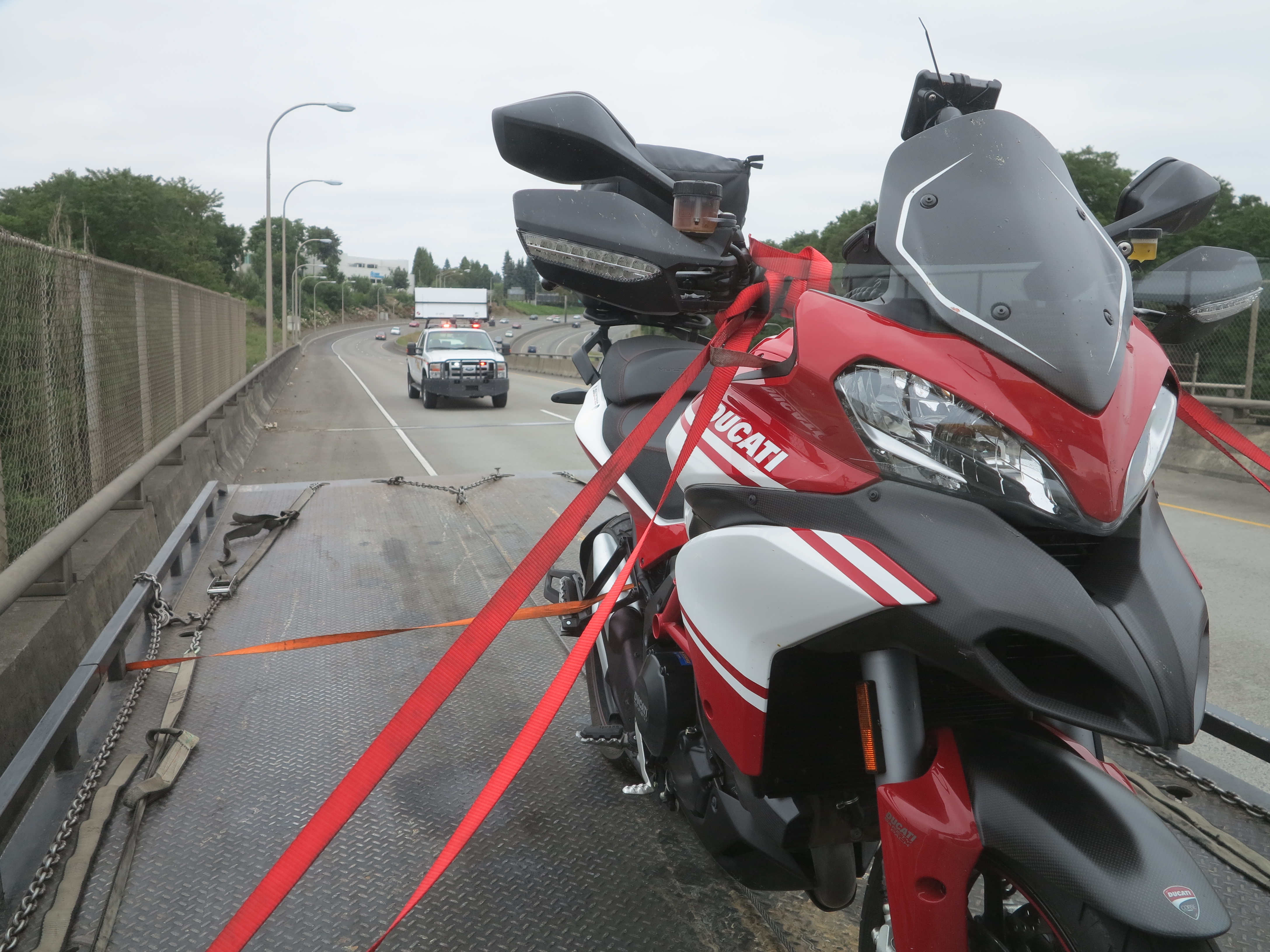 I called Ducati Roadside Assistance. Because it was Sunday and the local Ducati shop was closed, and Tuesday I was going on a long trip to the Marshall Islands, I had no option by tow my bike back to Eugene. At a $4 for mile it was going to cost me about $440 to tow it to Eugene and the Ducati Roadside Assistance service would only cover some $200 of it.  So I instead called AAA. It would cost me only $40 because I have the Plus membership covering 100 miles of towing.