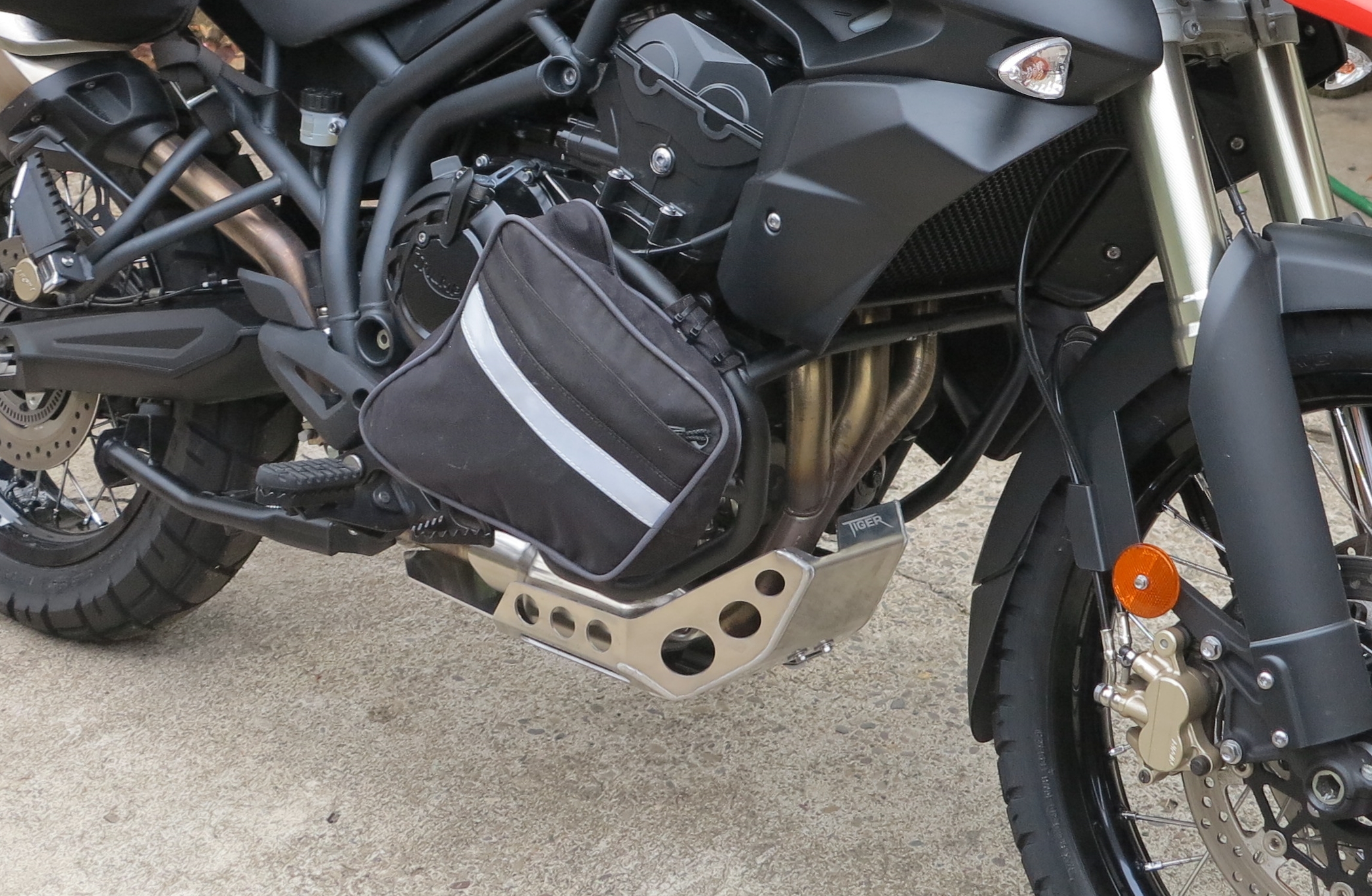 I got two bags that I attached to the engine guards. These bags are designed for a another bike, but they somewhat work in the Triumph. Not the best fit, I needed to make some adjustments, use zip-ties to attach them to the bars. They are handy to carry spare tubes and tools. But they are not water proof. That’s what you get for $60.