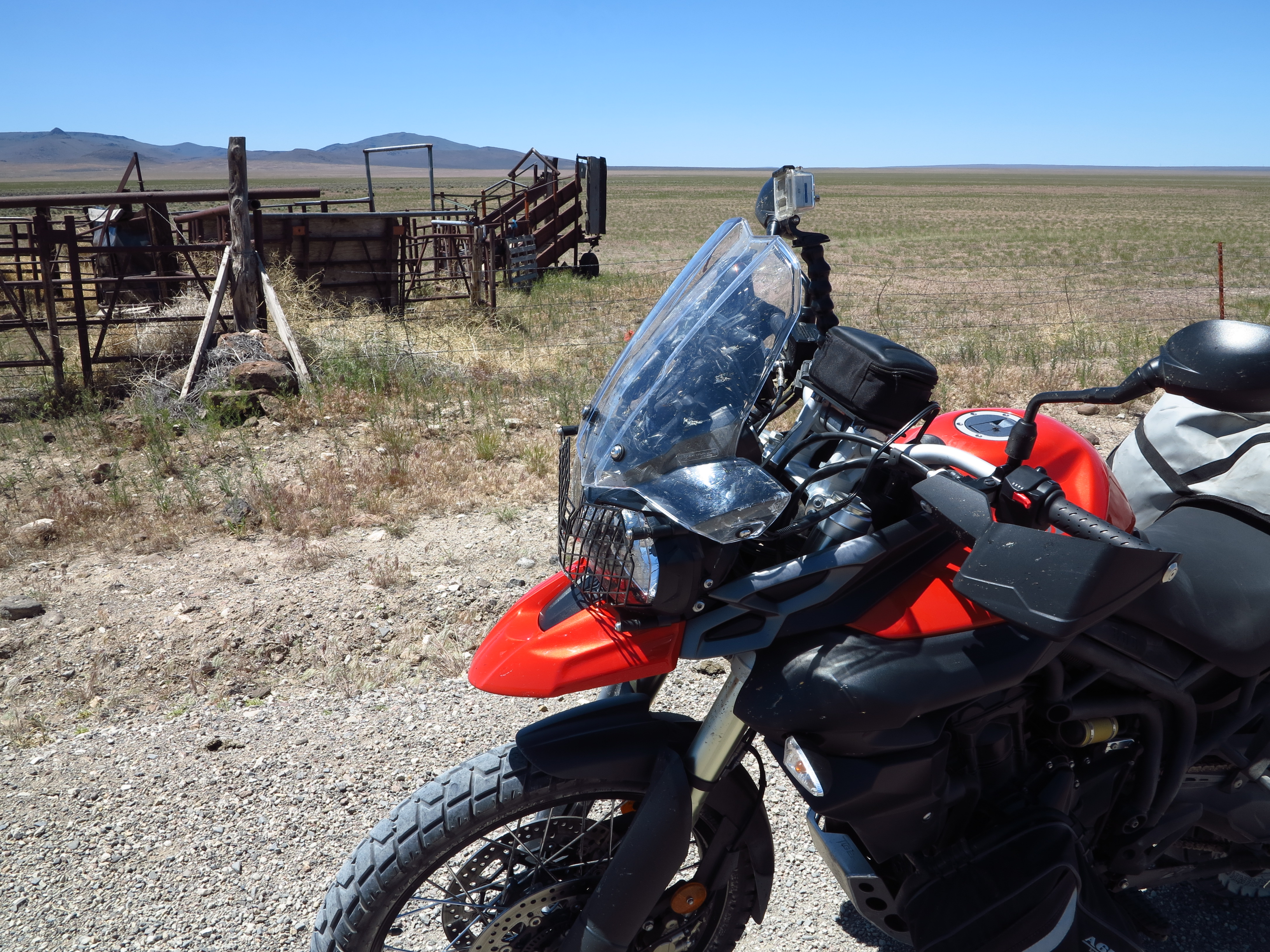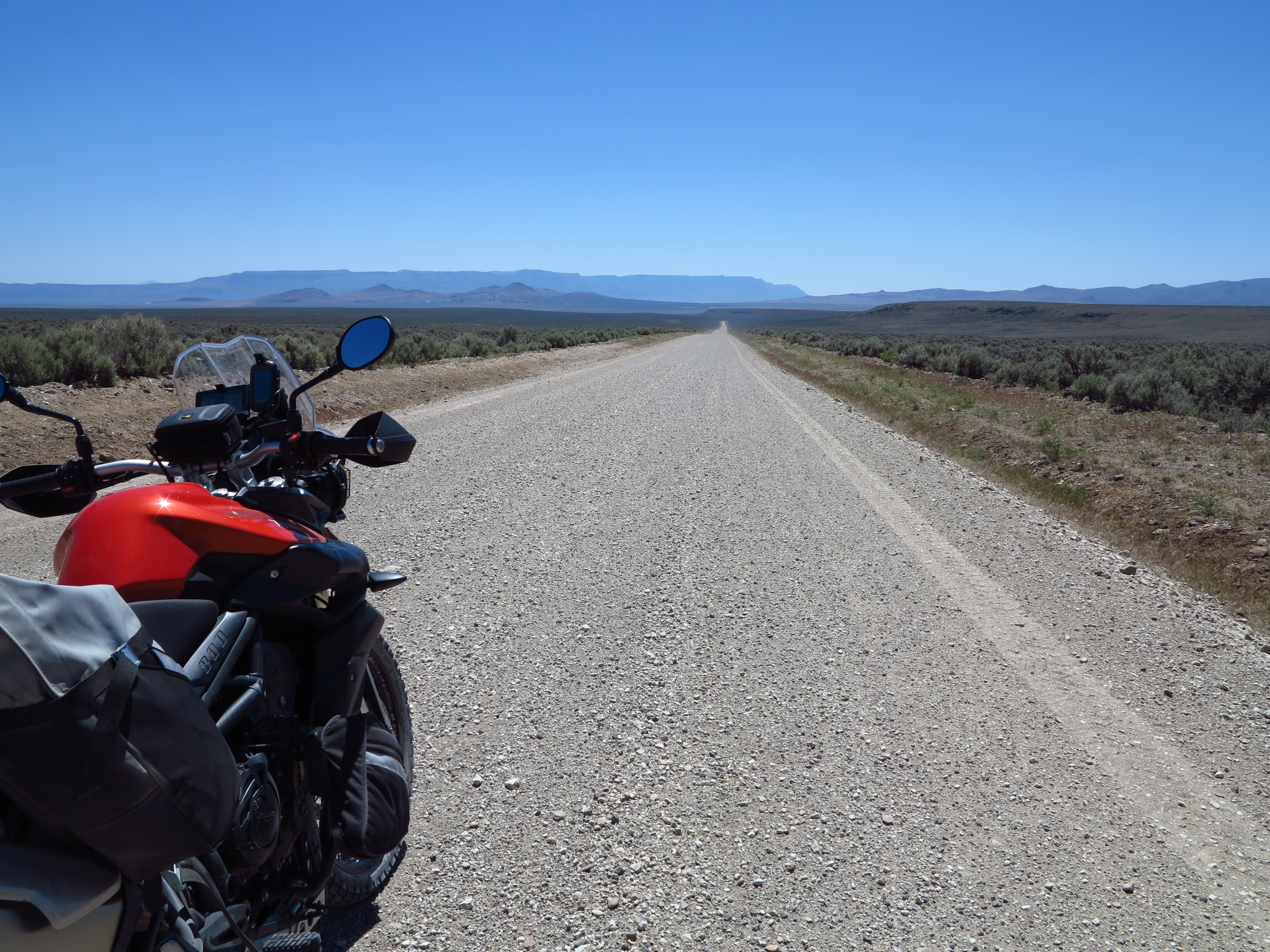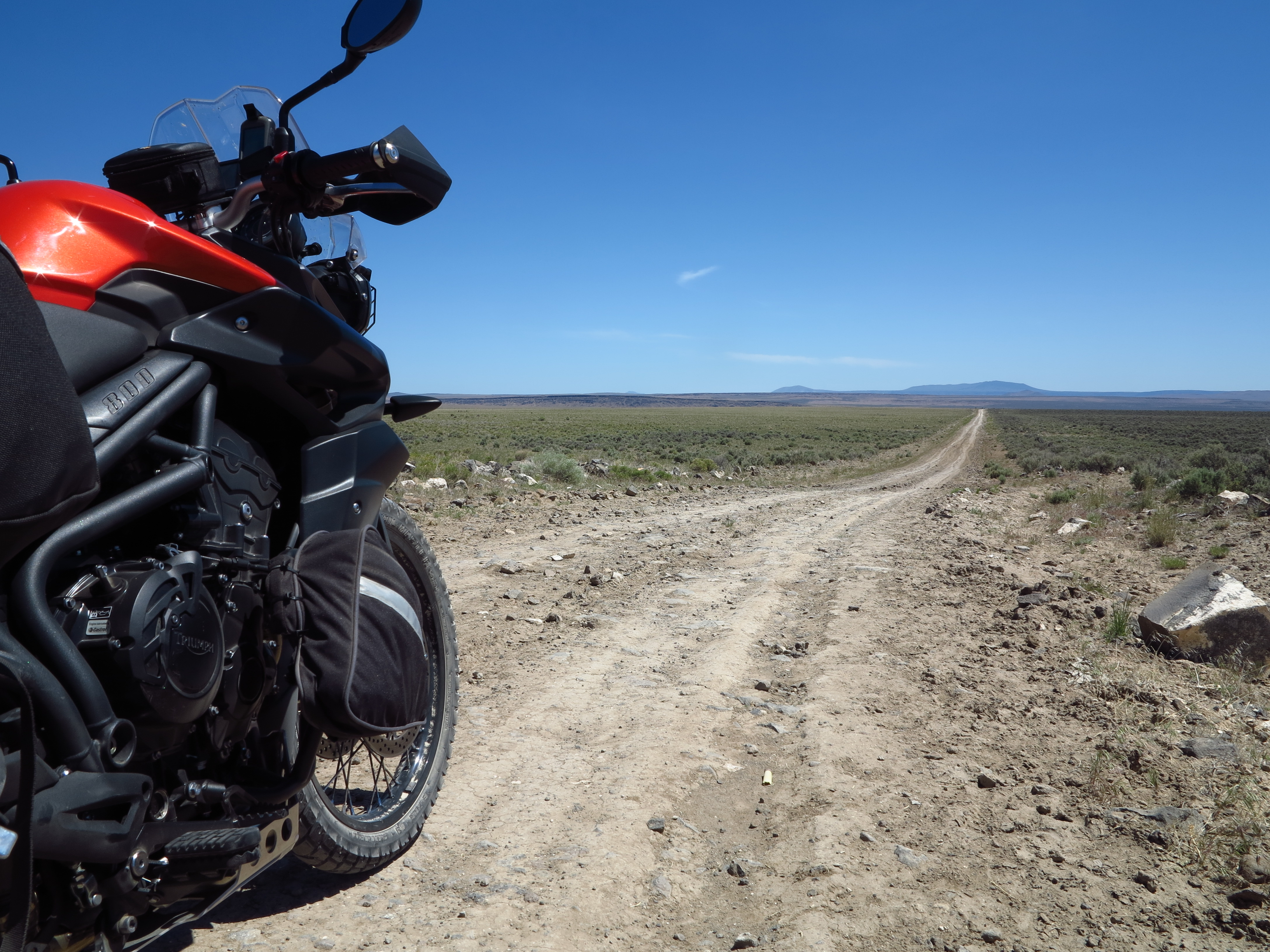 I’ve been wondering what the Tiger could do in those high desert open roads I like so much.  I visualized all the dirt roads I already know, roads with which I’ve gotten familiar since 2006 when I went to the Steens for the first time with the BMW F650 Dakar. And after that with the Yamaha WR250R a few times. These bikes, especially the WR250R, make riding in that area second nature, it’s a point-and-shoot motorcycle.  Knowing those roads well I know where potential challenging points for the heavier Tiger are, riding this bike on those roads would raise my riding level. So it was with trepidation that I loaded my gear on the Tiger and took it with me on this trip.