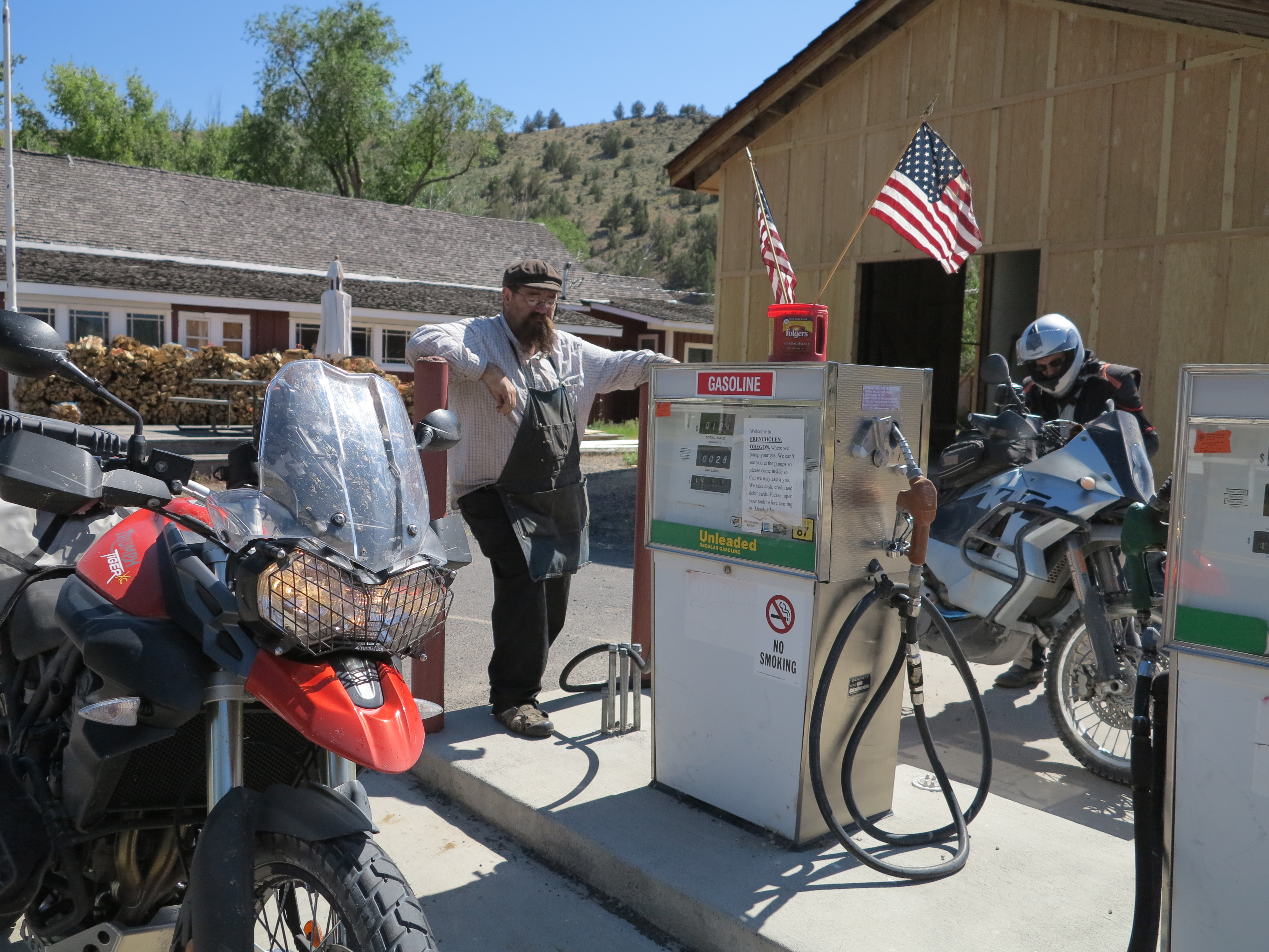 We topped off our tanks after the station’s owner (or manager?) was hinting about Frenchglen’s gas station’s reliability issues: “If he is there” or “if they have gas”, he said, warning us to not count on finding gas in the Frenchglen Mercantile. Yes, I’ve been there and they once had a sign saying: “back in 1 hour”. And they didn’t take credit cards either. But we could also get gas in Diamond, from the hotel staff. Or Fields. Anyway, we topped our bikes’ tanks off to be on the safe side. Reasonable planning is another item on the list of reasons to not need to have a “tanker” bike.