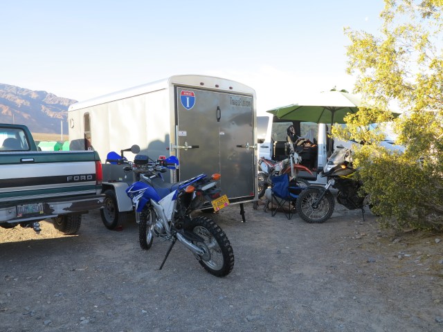 Back to the trip, all teams arrived at about the same time, we got settled on our camping area (Stovepipe Wells), we unloaded the bikes, and without much ado we were out for a ride towards Skidoo mines and then Aguareberry Point for the sunset. It was really warm in the valley, which leads me to another lesson: windows are not enough to manage hot days in the trailer, I will need to install a roof vent. I already looked into this, and when I complete this task I will prepare a complete post about the cargo trailer turned into a toy hauler travel trailer.