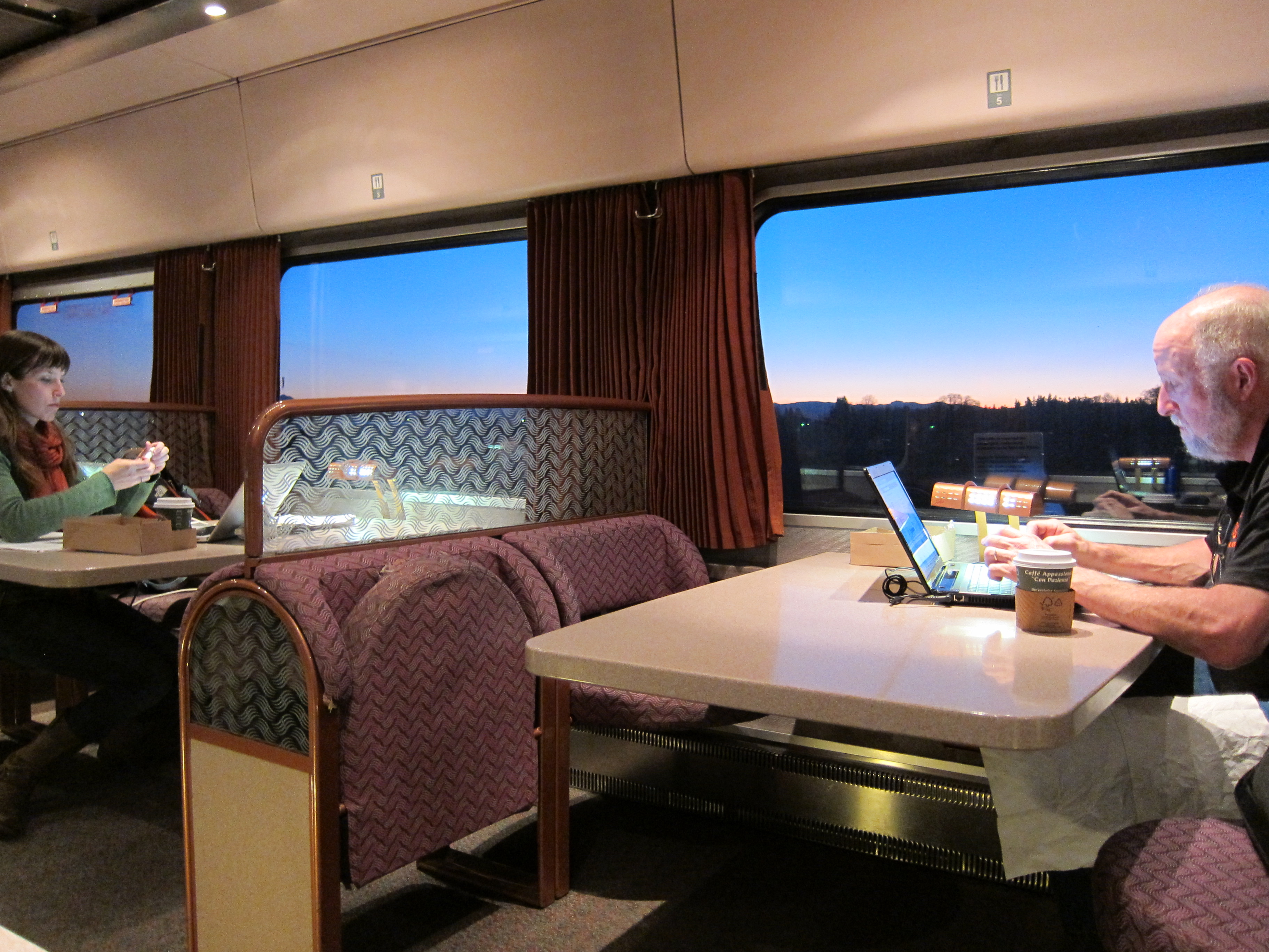 Passengers enjoy the comfort of a train ride Eugene to PDX. February 3rd, 2012